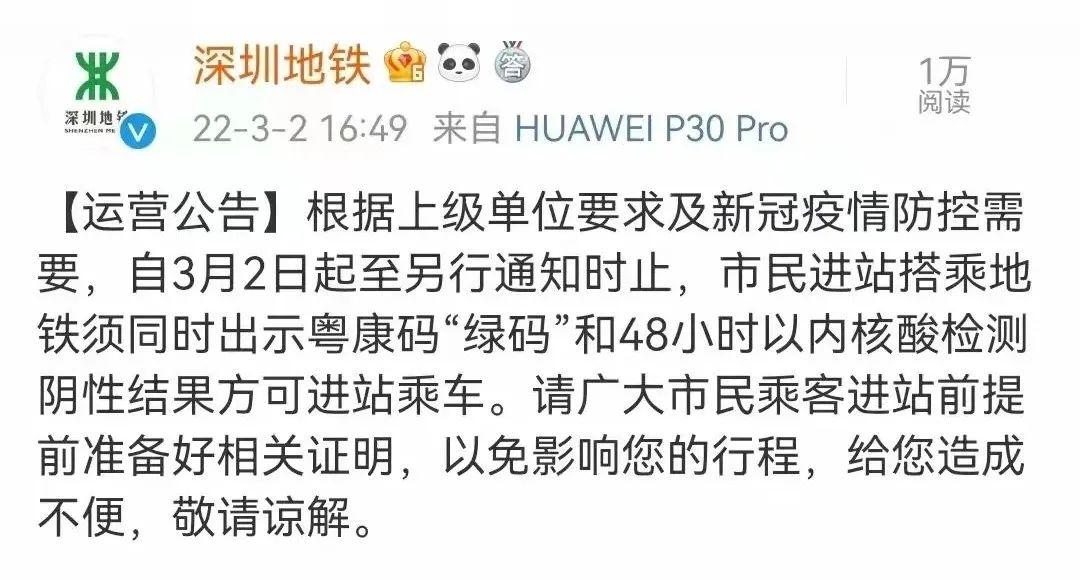 3月2日下午,深圳地铁发布最新【运营公告】:根据上级单位要求及新冠疫情防控需要,自3月2日起至另行通知时止,市民进站搭乘地铁须同时出示粤康码“绿码”和48小时以内核酸检测阴性结果方可进站乘车。请广大市民乘客进站前提前准备好相关证明,以免影响您的行程,给您造成不便,敬请谅解。