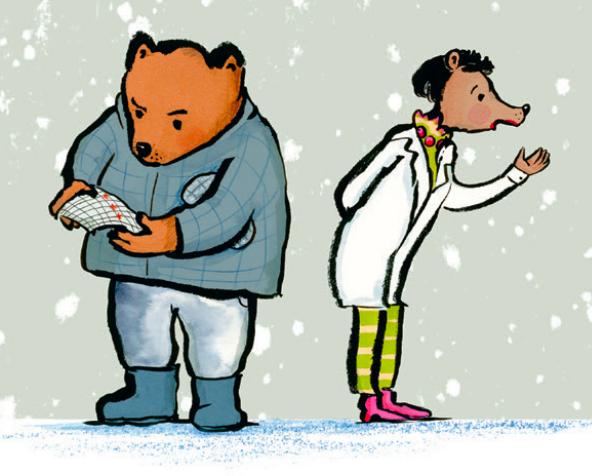 直到有一天,爸爸带小熊去见听觉矫正专家,她测试了小熊的听力,测试结果就像一条下坡的雪道,雪道上的小熊困惑、无助,这个画面也和滑雪的悬念相呼应。