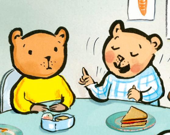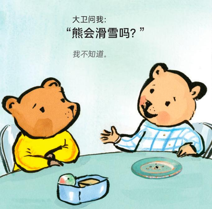 回到这本书,小熊第一次把“听得见我吗?“听成“熊会滑雪吗?“的时候,刚好在吃早餐。那会儿电视里正在播放滑雪。