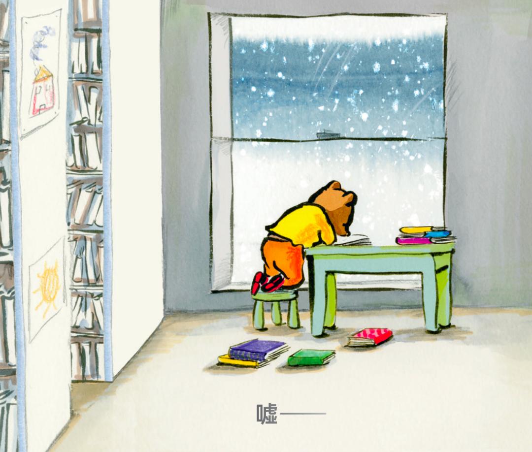 再如因为部分失聪,小熊的感官非常敏锐,能感受到声波导致的物体震动。与此同时,也有一些页面是无声的。小熊临窗看雪的惬意,在图书馆独处的静谧,让绘本整体上有了一种呼吸感。