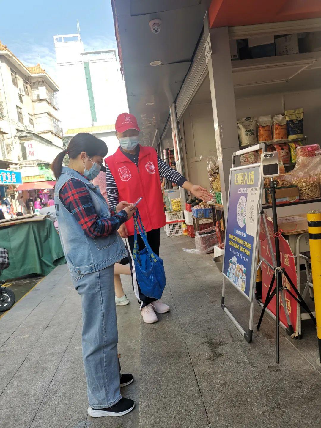 深圳部署了农贸市场新的防疫措施,如进入农贸市场需扫市场“场所码”、戴口罩和测体温。由于“场所码”刚刚开始推行,志愿者需耐心向市民解释扫码打卡的意义。志愿者舒胜强说:“如果每一个进入农贸市场的市民都扫场所码,可以把疫情阻挡在农贸市场的门外。”