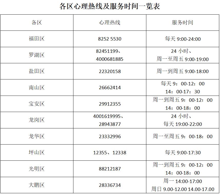 各区心理热线及服务时间一览表