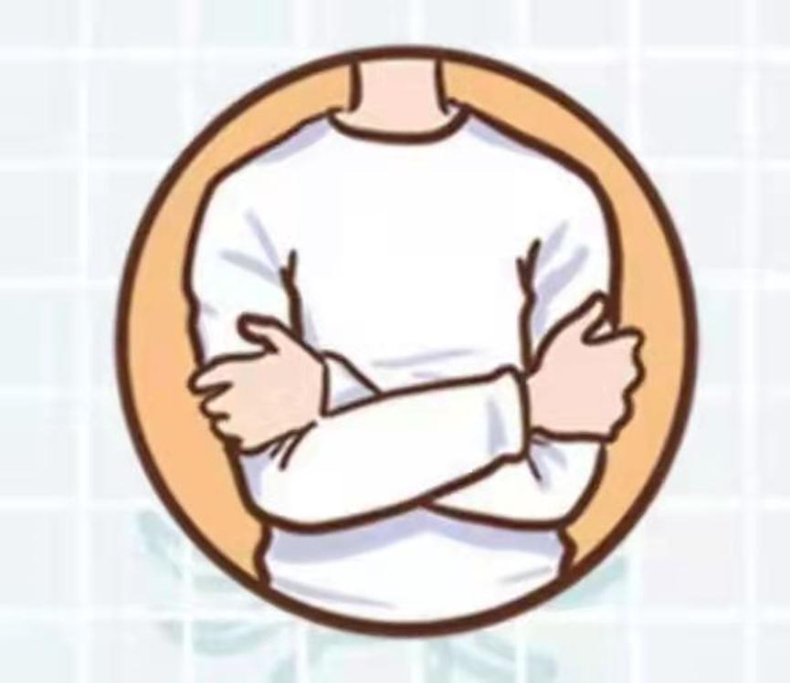 双臂胸前交叉,右手在左侧,左手在右侧,轻抱自己对侧的上臂或肩膀(如果不习惯这个姿势,也可以双手分手放在同侧的大腿上)。