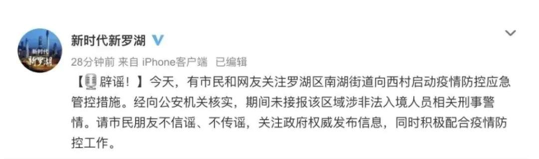 【辟谣!】今天,有市民和网友关注罗湖区南湖街道向西村启动疫情防控应急管控措施。经向公安机关核实,期间未接报该区域涉非法入境人员相关刑事警情。请市民朋友不信谣、不传谣,关注政府权威发布信息,同时积极配合疫情防控工作。