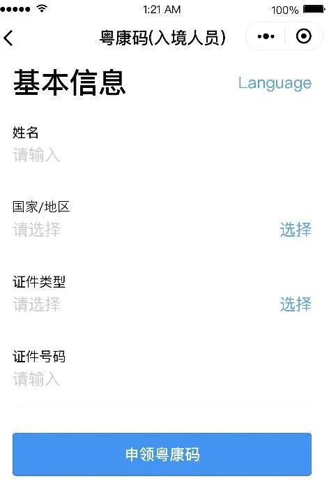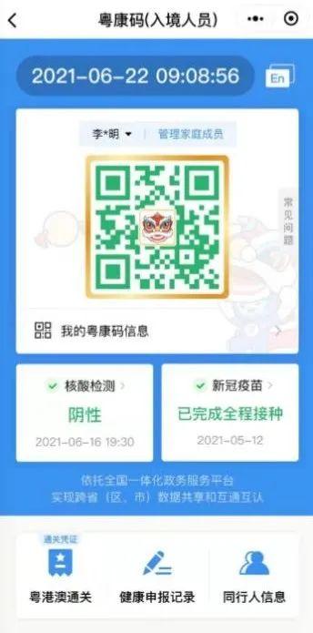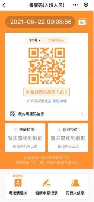 入境人员“粤康码”界面