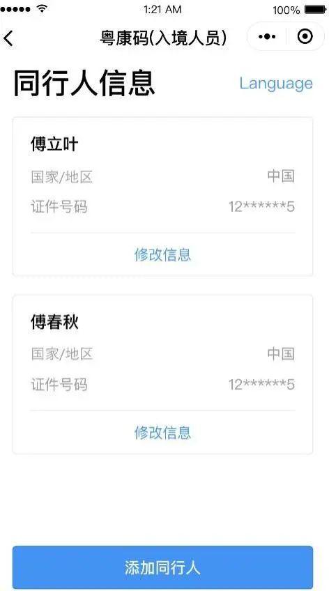 添加同行人员的入境人员“粤康码”