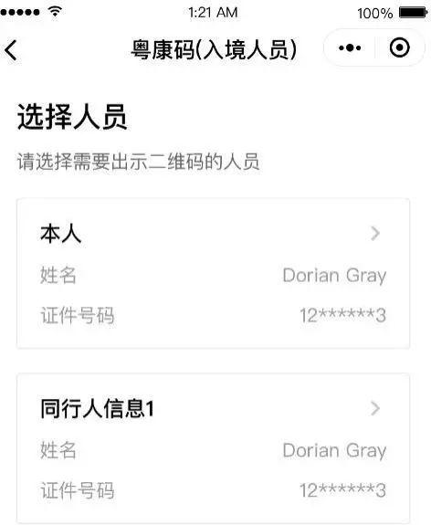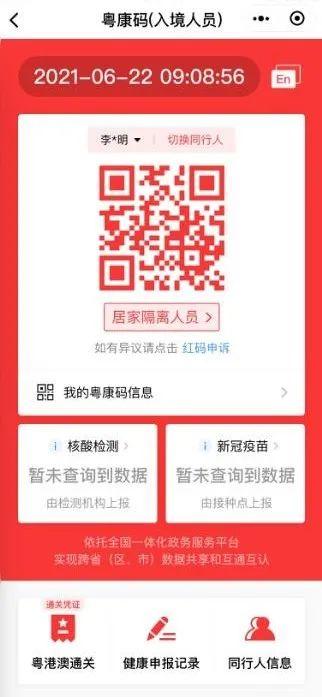 添加同行人后,可点击入境人员“粤康码”页面顶部的“切换同行人”切换本人、同行人之间的“粤康码”(入境人员版)。