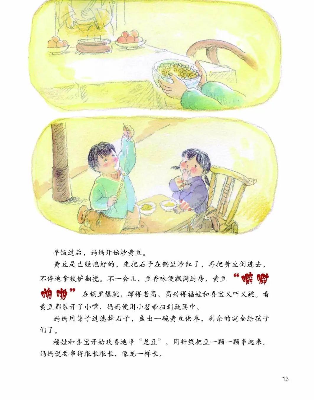 绘本中还讲到了关于春龙节的两个传说:有来自民间传说,王中令讨吃猪头肉听猪头诗的故事;有出自神话传说,老百姓炒金豆救龙王的故事。春龙节传递着人们祈盼这一年吉祥平安、五谷丰登、鸿运当头、福星高照的美好愿望。