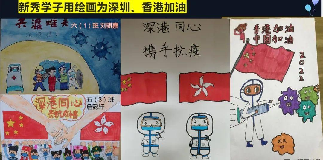 新秀小学开展了“深港童心 携手抗疫”主题作品征集,同学们纷纷以绘画、歌唱、朗诵、书法等多种形式,为深圳、香港抗疫加油,为伟大祖国加油。有描绘白衣天使出征、表现深港携手抗疫决心的画作,有饱含激情祝愿和感动的朗诵,有唱出深港人民上下同心的歌声,还有寄托祝福、共待春暖花开的书法……学生们还对身边的港籍同学和亲朋好友直接传递了他们的挂念和鼓励,共同为香港、深圳打气加油。