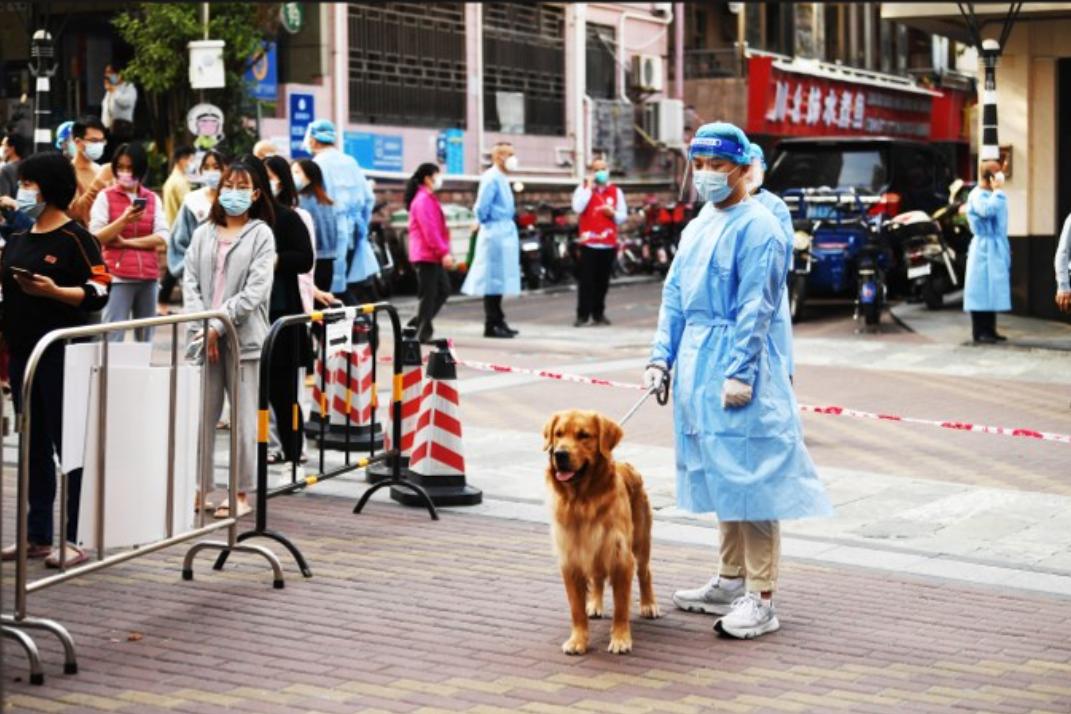 志愿者为前来接受核酸采样的市民暂时看护宠物。