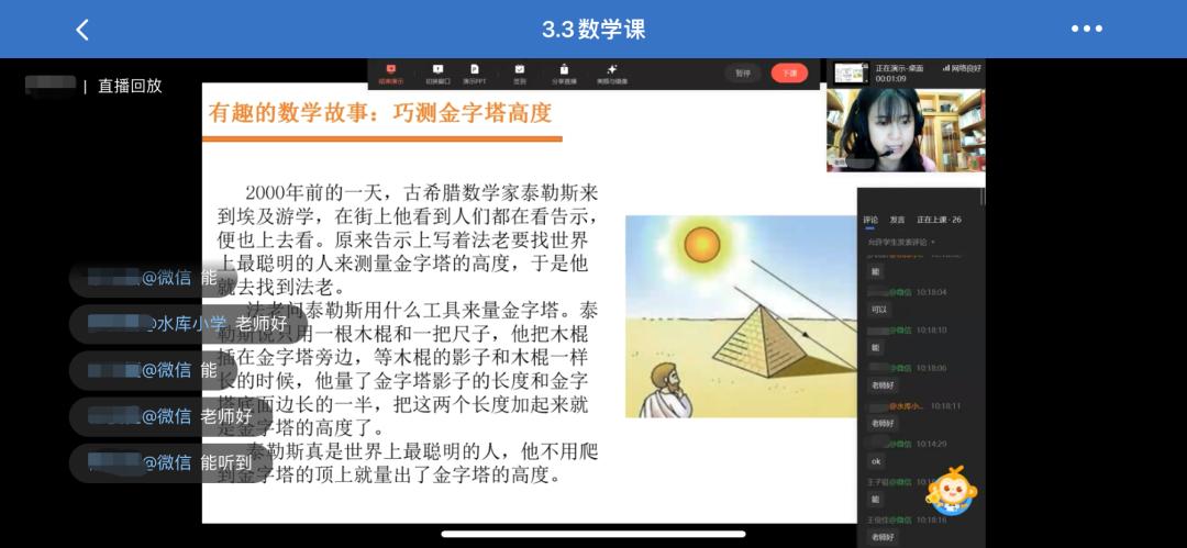 为激发学生参与线上教学的兴趣,打造互动活泼的云课堂,水库小学的老师们各显神通,带领同学们课前诵读国学经典,欣赏有趣的数学故事。