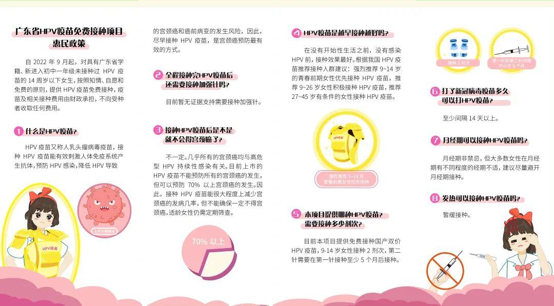 2022年,广东省实施适龄女生HPV疫苗免费接种项目,为具有广东省学籍、2022年9月起新进入初中一年级且未接种过HPV疫苗的14周岁以下女生,按照知情、自愿、免费的原则,提供HPV疫苗免费接种。将宫颈癌防治关口进一步前移。详细了解→【重磅】9月起,广东适龄女生可免费接种国产双价HPV疫苗!