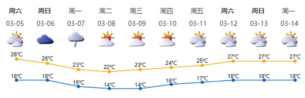 5日多云温暖,有轻雾或霾,气温18-28℃;