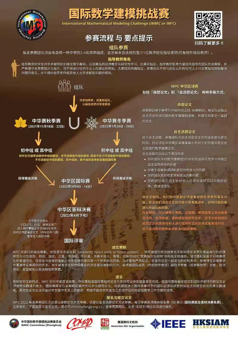 国际数学建模挑战赛(IMMC,immchallenge.org.cn)在2014年创办于美国波士顿,是一项面向全球中学生的国际性新型数学建模竞赛。IMMC既是中学生数学建模与STEM实践历练的舞台,也是参赛中学的数学暨STEM教育成果展示与交流的园地。来自世界各地的参赛团队经过国家/区域赛的选拔,进入国际赛程。中华区域赛(面向中国大陆、台湾、香港和澳门的中华团队)分为秋季和冬季两个赛季,参赛团队可自由选择参加其中一季或两季竞赛,以最佳成绩参加中华区年度总评选及晋级国际赛。