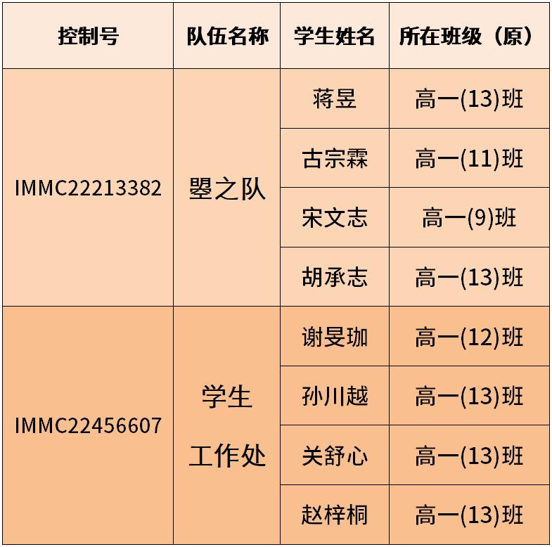 2021年11月11日,学校发出《关于组织第八届国际数学建模挑战赛IMMC2022中华区秋季赛的通知》,在征求学生及家长的同意下,共有20名学生组成5支队伍参加了11月18日20:00开始的中华区秋季赛,连续96小时。