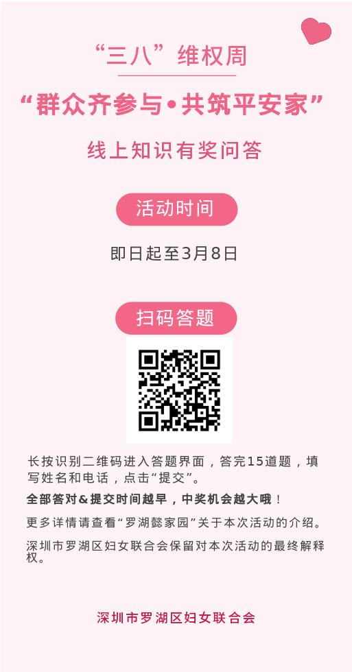 为进一步提升妇女群众依法维权的意识和能力,积极营造全社会尊重妇女、维护妇女合法权益的氛围,罗湖区妇联开展“群众齐参与,共筑平安家”“三八”维权周有奖问答活动。