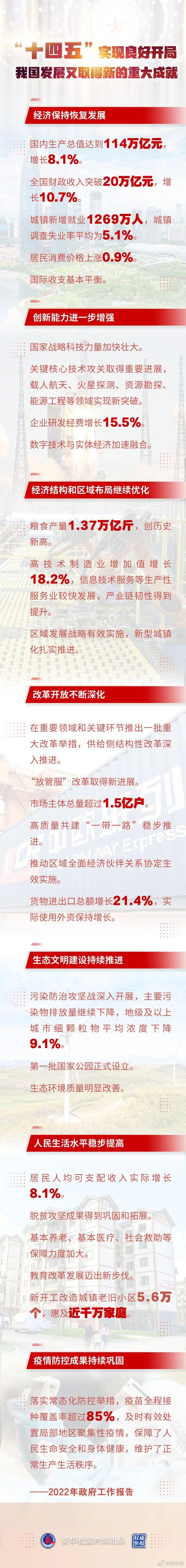 5日提请十三届全国人大五次会议审议的政府工作报告提出,一年来,面对复杂严峻的国内外形势和诸多风险挑战,全国上下共同努力,统筹疫情防控和经济社会发展,全年主要目标任务较好完成,“十四五”实现良好开局,我国发展又取得新的重大成就。