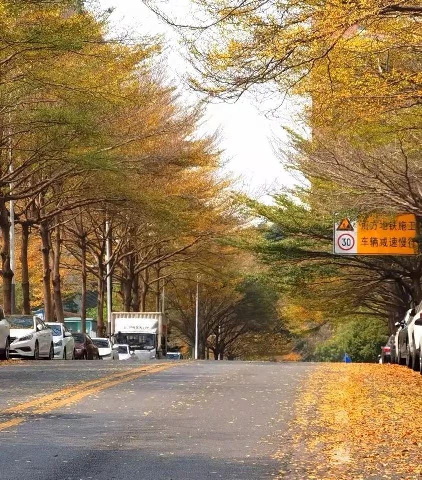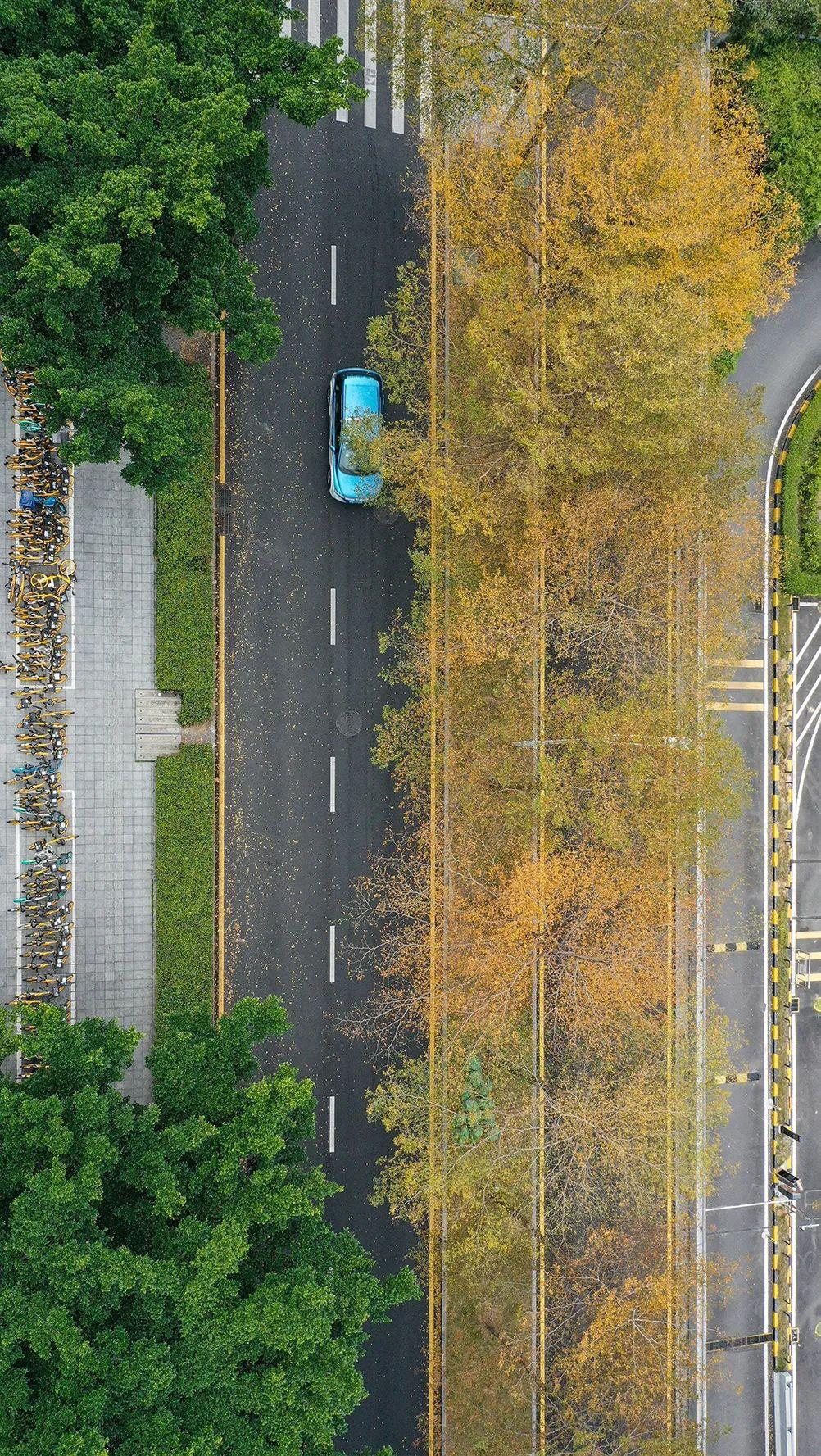 左侧金黄色的树叶飘飘洒洒