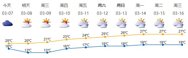 ●3月7日,阴天转多云,气温16—20℃;3月8日—10日,晴天干燥,早晚清凉,其中3月8日—9日最低气温13℃左右。
