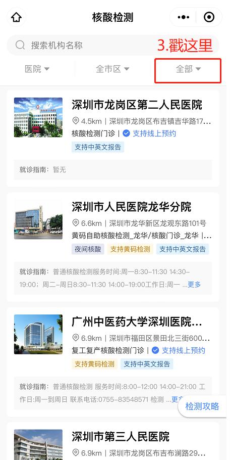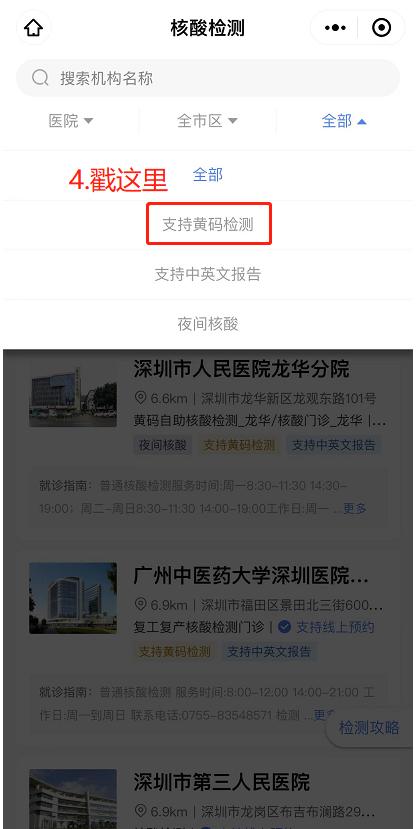 3.右上角点击【支持黄码检测】,可查询全市黄码检测医疗机构。