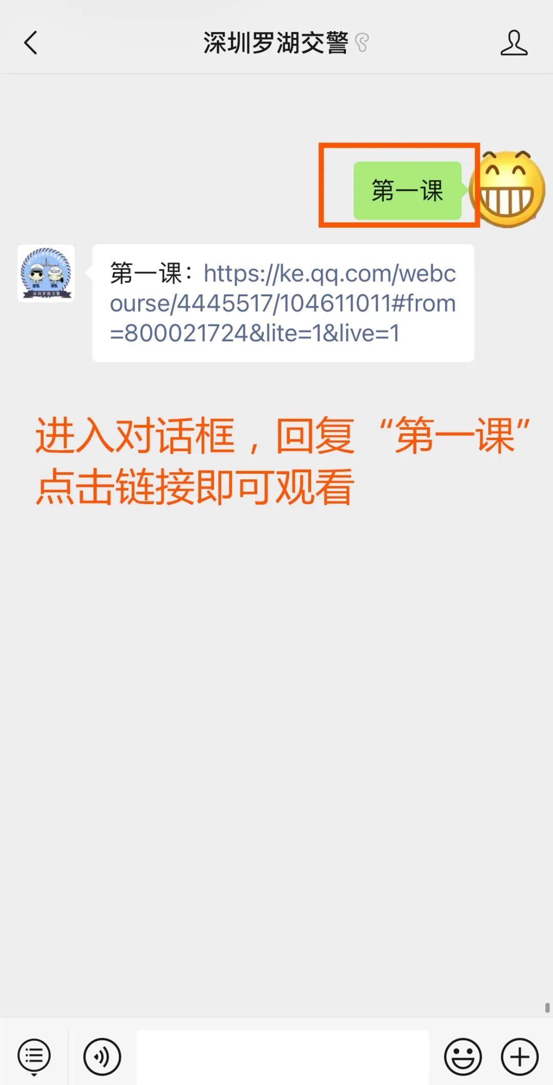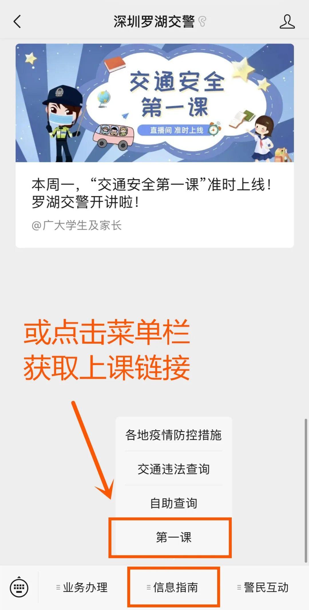 关注【深圳罗湖交警】微信公众号,点击下方菜单栏或回复关键词【第一课】,即可进入课堂直播间。