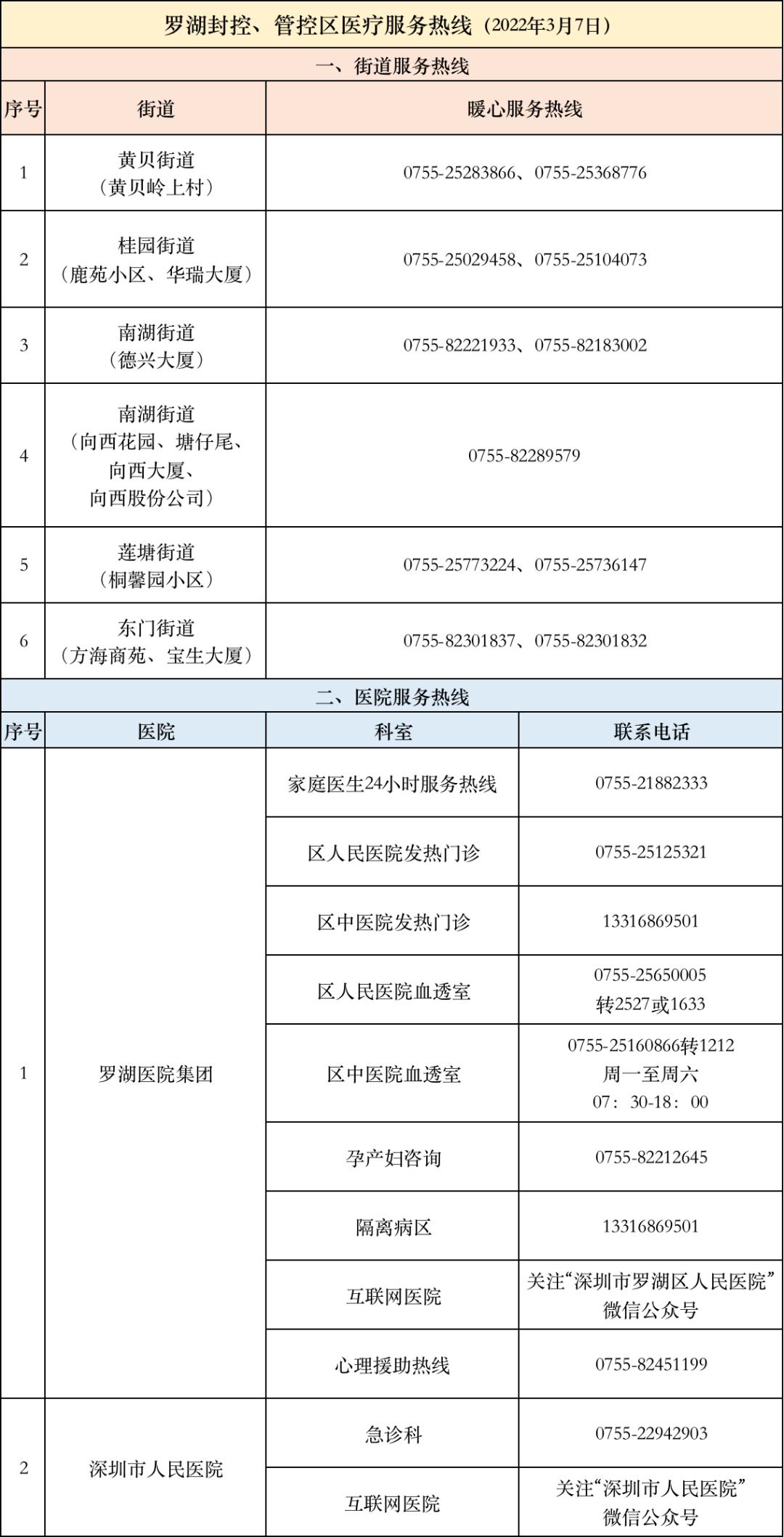 罗湖区各街道建立片区保障服务工作制,成立了医疗生活服务小组,需就医市民可拨打各街道暖心服务热线表达就医需求。孕产妇、血透患者、受情绪心理问题困扰人员等可拨打各医院咨询电话获取健康指导。