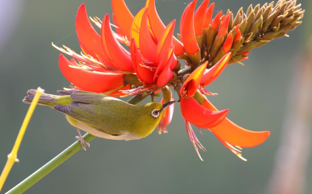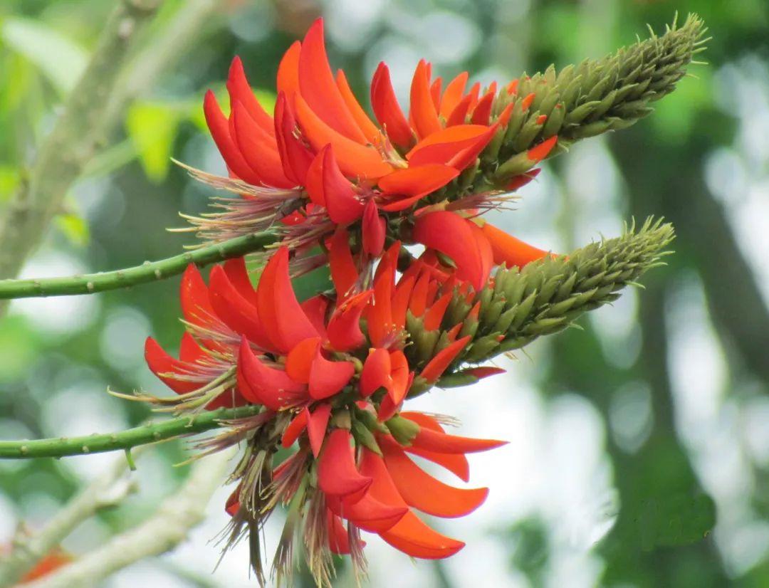 落叶小乔木,叶宽卵状三角形。总状花序腋生,先于叶开放,花冠鲜红色。