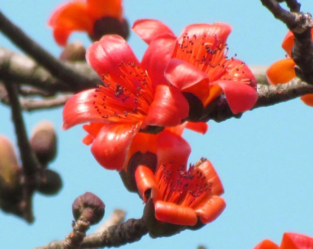 落叶大乔木。花大,通常红色,少数橙红色,盛开时叶片几乎落尽,远观好似一团团在枝头尽情燃烧、欢快跳跃的火苗,极有气势。因此,历来被人们视为英雄的象征。木棉花是广州市的市花,也是广西壮族自治区崇左、四川攀枝花和台湾台中市的市花。