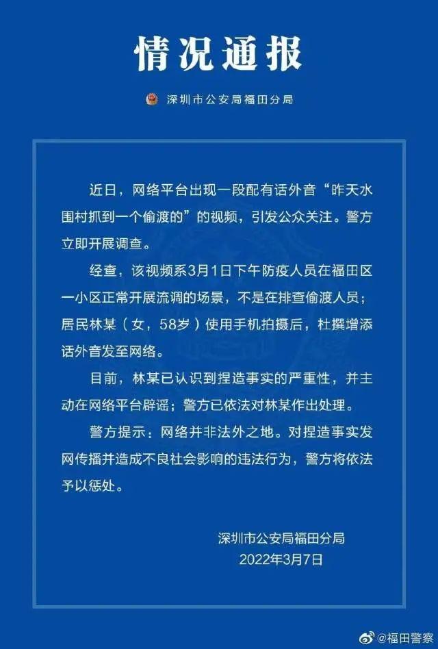3月7日,深圳市公安局福田分局通报,近日,网络平台出现一段配有话外音“昨天水围村抓到一个偷渡的”的视频,引发公众关注。警方立即开展调查。