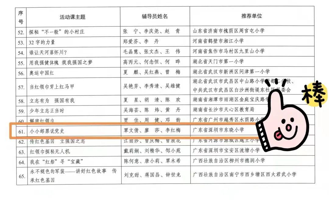 近日,2021年全国优质少先队活动课展示交流活动落下帷幕,经各地积极推荐申报,团中央少年部、教育部基础教育司、全国少工委办公室综合评议,最终确定了100节2021年全国优质少先队活动课,我省有四节课入选,罗湖占一席:罗湖区李红梅名辅导员工作室成员、东晓小学覃文倩老师执教的《小小邮票说党史》荣获全国优质少先队活动课!热烈祝贺!