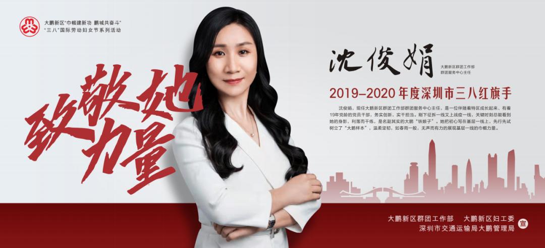 沈俊娟,现任大鹏新区群团工作部群团服务中心主任,有着19年党龄的党员干部,务实创新,实干担当。刚下征拆一线又上战疫一线,关键时刻总能看到她的身影,利落而干练,是名副其实的大鹏“铁娘子”。她把初心写在基层一线上,先行先试树立了“大鹏样本”,温柔坚韧,如春雨一般,无声而有力的展现基层一线的巾帼力量。