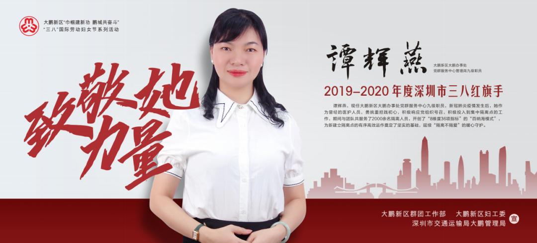 谭辉燕,现任大鹏新区大鹏办事处党群服务中心九级职员,新冠肺炎疫情发生后,作为曾经的医护人员,她勇挑重担践初心,积极响应党组织号召,积极投入到集中隔离点的工作,期间与团队共服务了2000余名隔离人员,开创了“8维度36项指标”的“百纳海模式”,为新建立隔离点的有序高效运作奠定了坚实的基础,延续“隔离不隔爱”的暖心守护。