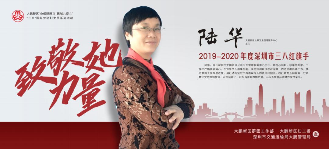 陆华,现任深圳市大鹏新区疾病预防控制中心主任。她尽心尽职,以单位为家,工作中严格要求自己,在危急关头冲锋在前,及时协调解决存在问题,传达部署各项工作,及时掌握工作推进进度,用行动与坚守书写着疾控人的责任和担当,践行着为人民服务、守百姓平安的铮铮誓言,在抗疫路上,以担当贡献巾帼力量,无私无畏展示新时代女性荣光。