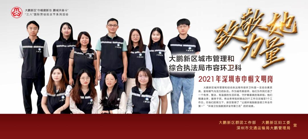 大鹏新区城市管理和综合执法局市容环卫科是一支综合素质高、富有朝气与活力的队伍。作为城市美容师,他们为市民打造了一个有序、整洁、有温度的生活环境;他们精通业务、服务于民,将业务审批时限由20个工作日压缩至1个工作日。在他们的努力下,新区取得了“公厕环境指数连续三年全市第一”“环境卫生指数测评全市第三名”的好成绩。