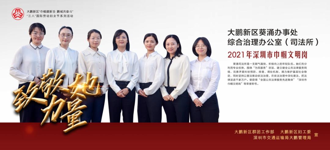 葵涌司法所是一支朝气蓬勃、积极向上的年轻队伍。她们充分利用专业优势,围绕“为民服务”宗旨,建立健全公共法律服务网络,完善矛盾纠纷预防、排查、调处机制,竭力维护基层社会稳定,同时坚持以普法推动依法治理,在依法治理中深化普法,把法律送进千家万户。曾获得“全国公共法律服务先进集体”“深圳市巾帼文明岗”等荣誉称号。