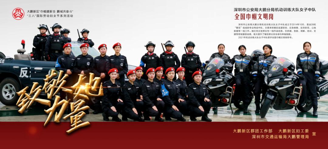 深圳市公安局大鹏分局机动训练大队女子中队成立于2014年10月,是由39名“警花”组成的专业特战中队,主要承担辖区巡逻防控、应急维稳、反恐防范、山地救援等一线工作。她们充分发挥女性一线作战优势,在抓捕、急救、调解、培训、支援等领域屡获战绩,极大提升了辖区群众安全感与幸福指数。