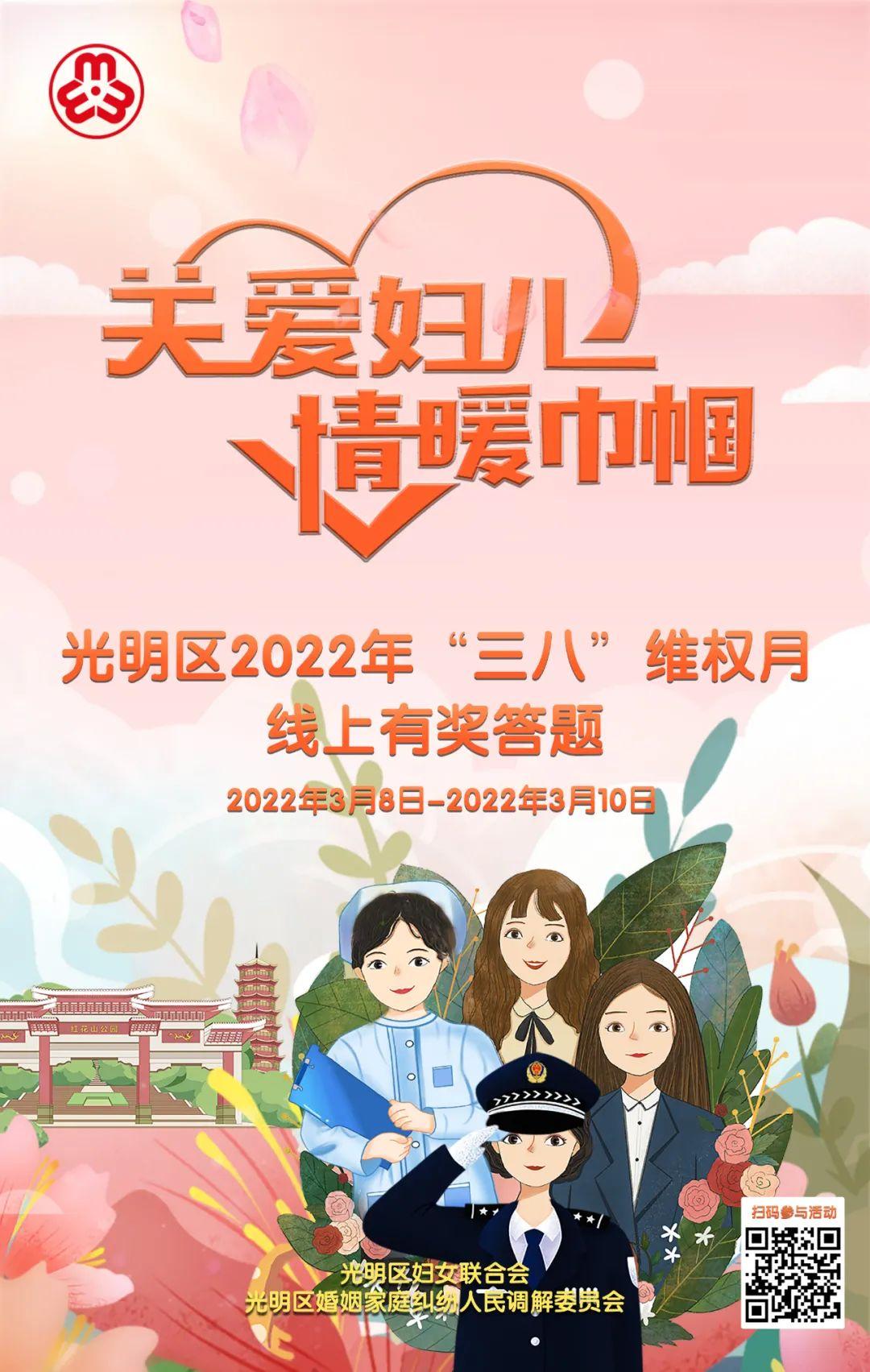 为认真学习贯彻以习近平新时代中国特色社会主义思想,全面贯彻落实《中国妇女发展纲要(2021-2030年)》《中国儿童发展纲要(2021-2030年)》,推动新时代妇女事业和妇联工作开创新局面。由光明区妇女联合会、光明区婚姻家庭纠纷人民调解委员会联合举办的“‘关爱妇儿 情暖巾帼’光明区2022年‘三八’维权月”线上有奖答题今天开始咯,快来扫描下方二维码参与答题!