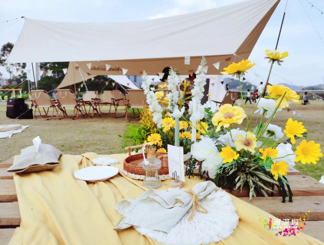 米白色的帐篷,席地摆放的木质餐桌与编藤坐垫,精致的餐具与摆件,每个细节都洋溢着田园ins风,满眼都是归园田居的隐世浪漫。