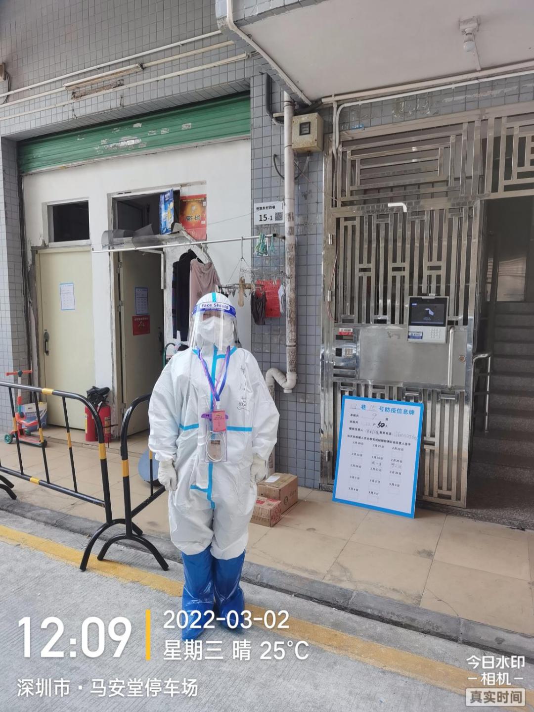 2月18日,她收到街道指令跟着她们街道的伙伴们一起连夜奔赴坂田街道马安堂社区,全力支援坂田疫情防控工作,尽自己做大努力保障坂田居民的生命安全。进入马安堂社区后,她跟小伙伴们起早贪黑,每天都要爬楼梯通知每家每户做核酸检测,给每户居民送水果等生活物资,晚上要等到核对完信息之后才能回去休息,尽管走楼梯走得腰酸腿痛、工作繁重也导致休息不足,但是她们没有一句怨言,“只要能让疫情早日结束,我们的辛苦都是值得的。”