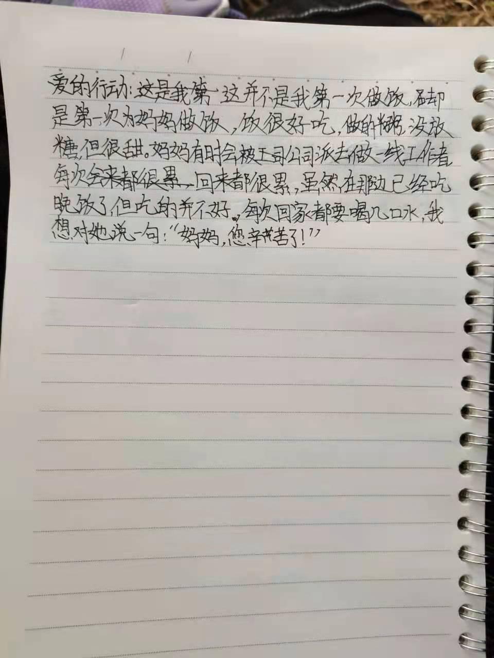 我的同事郝红,虽然还没有加入中国共产党,但她却以党员的标准严格要求自己。疫情发生以来,她和单位里的志愿者一并加入了支援抗疫的队伍。在疫情防控点,她是仔细工作的扫码员,她也是不厌其烦教大家亮码的引导员。天气温度变化无常,无论是最冷的那几天,还是气温回升酷热难耐的这几天,她都义无反顾地在支援点坚守。小作文是她十二岁女儿为她创作的,因为要在核酸点支援,她没办法顾及女儿的晚餐,但贴心的女儿自己学会了煮粥,报答妈妈平日的照顾,也因为理解到了妈妈支援核酸点的辛苦。