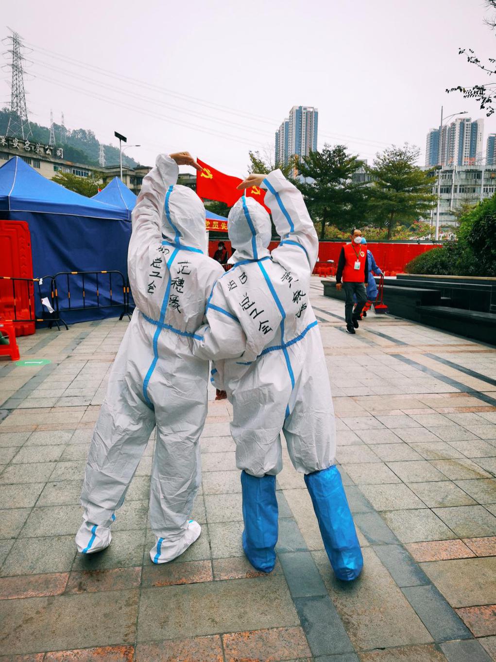 在0107疫情发生后,工会组织立即响应街道疫情指挥中心的部署,组织工作人员积极参与管控区专项工作。黄铱婷、范穗缘都是其中的一员,两位女同志家里均是上有老下有小,甚至另一半也都在疫情的另一战线上,但此刻她们只知道一定要尽自己最大努力,同心协力才能跑在病毒之前,换好防护服准备战斗前一刻,看着迎风飘扬的党旗,脚下仿佛有无限的力量。