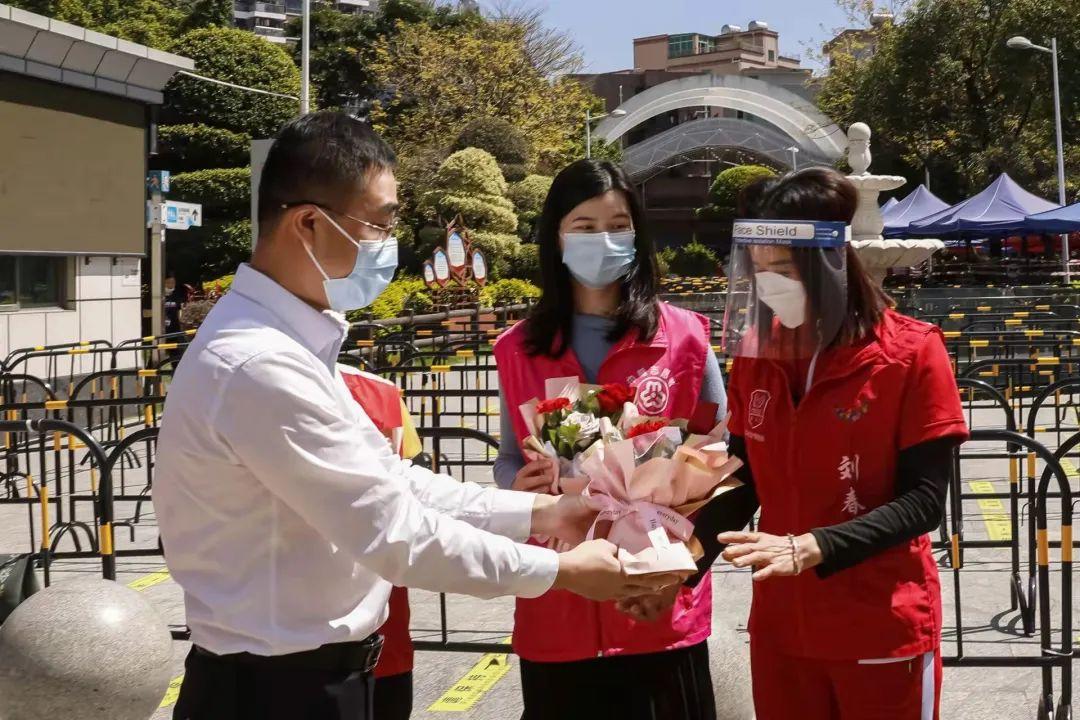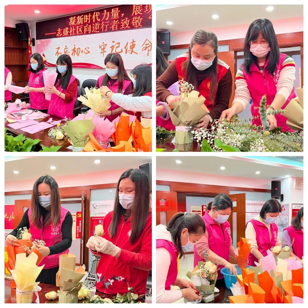 鲜花送天使,致敬逆行者。“送给你小心心,送你花一朵。”志盛社区妇联组织巾帼志愿者裁纸包花泥做花托、搭配鲜花插花束,献给卓越弥敦道核酸检测点的医护人员以及始终坚守防疫一线岗位的女性工作人员,致敬最美逆行者,感谢她们在这场战“疫”中的付出和担当。