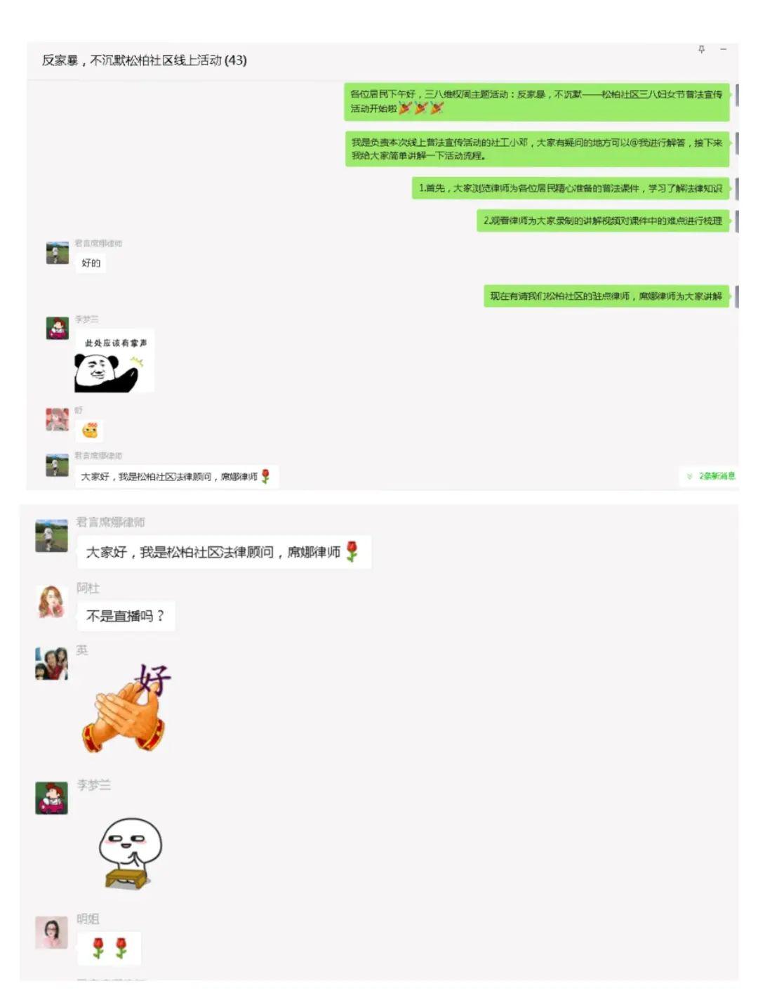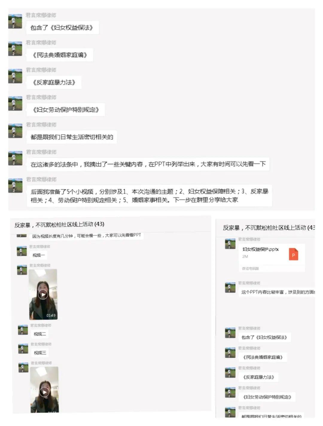 松柏社区举办“三八”维权周主题活动:反家暴,不沉默——普法云宣传活动。活动分为三个环节,分别是律师讲法、普法知识趣味问答、活动收获感想分享。社区驻点席娜律师通过“课件+视频”的模式,让居民们由浅入深的了解妇女权益保护的相关知识。居民陈小姐说:“感觉这个活动很有意义,能了解到一些基本法律知识,让我们知道当权益受到侵害时该如何应对,希望以后能有更多学习的机会。”