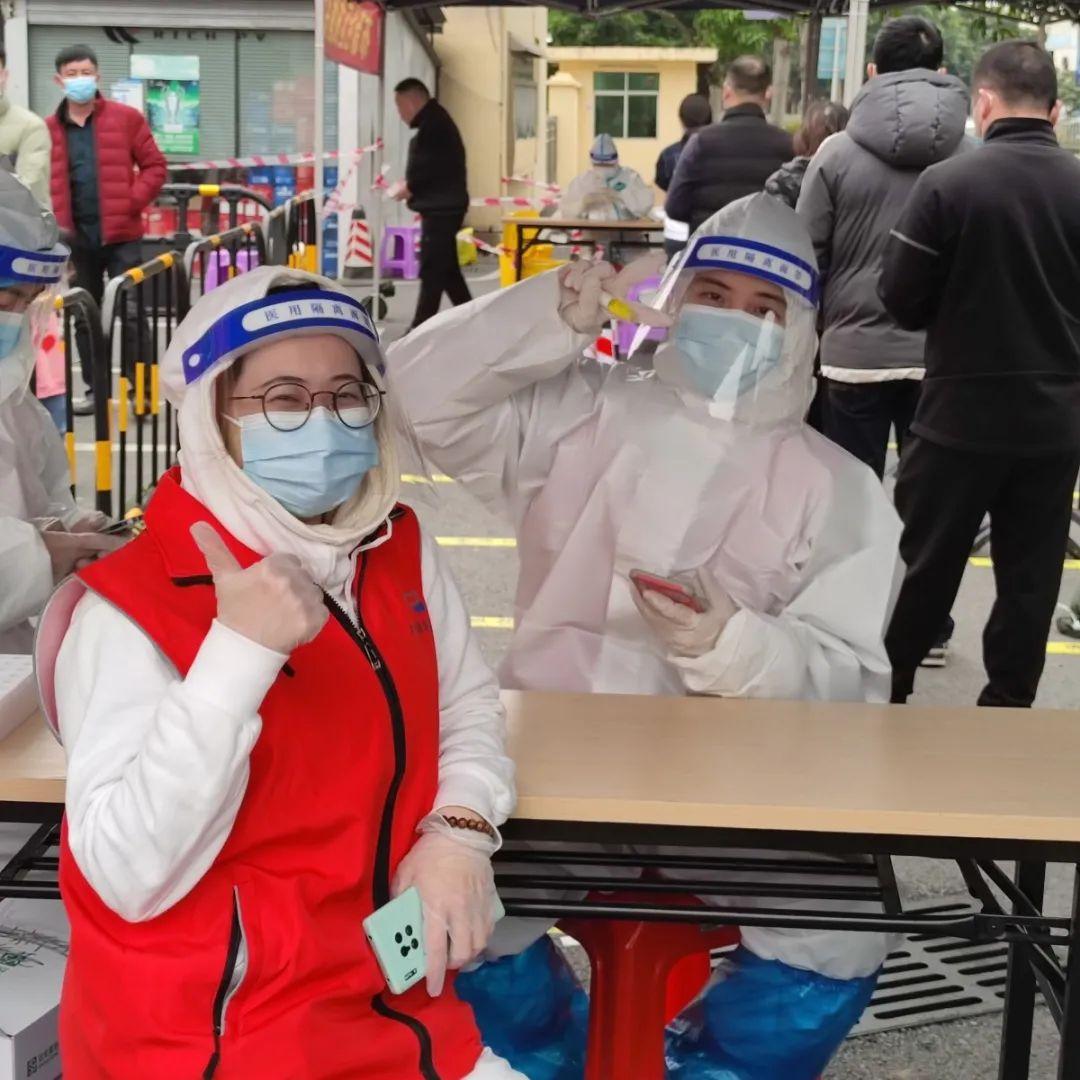 她们身穿红马甲和防护服