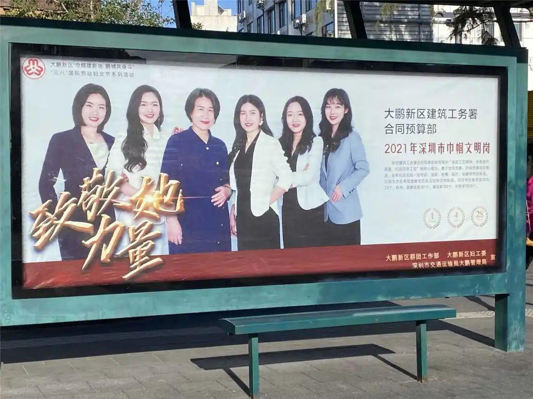 近日,大鹏新区建筑工务署合同预算部在新区“致敬‘她’力量”学习宣传活动中,作为荣获深圳市“巾帼文明岗”先进单位“站”上了大鹏中心公交站台,成为了新区一道亮丽的风景线。