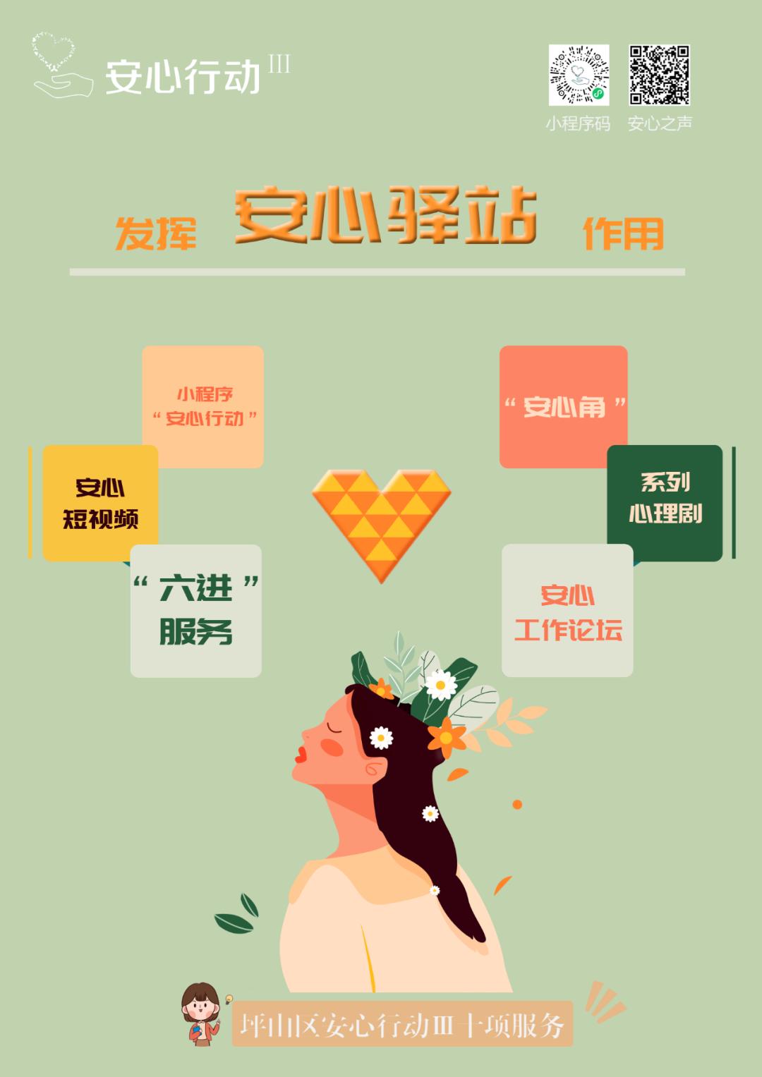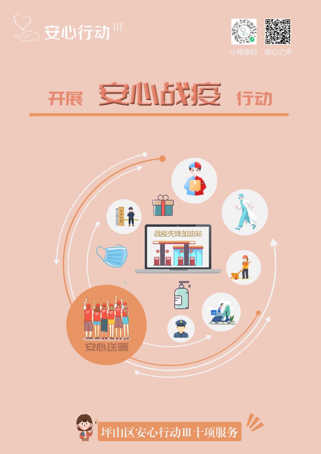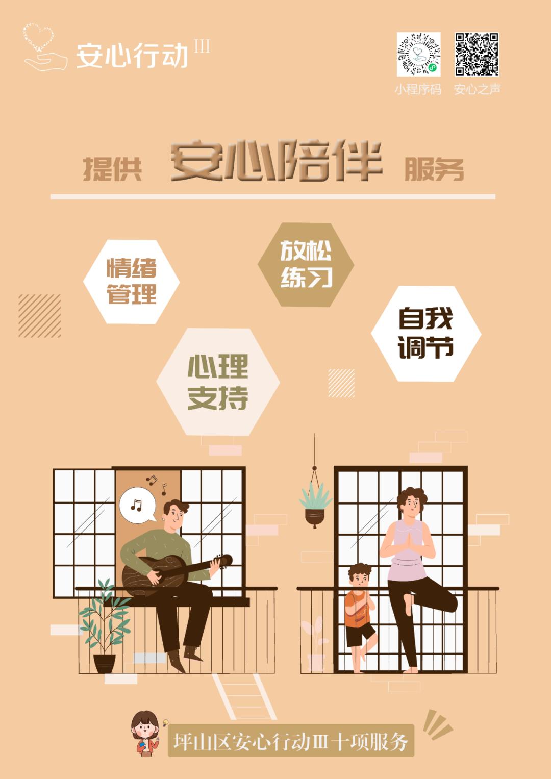 为了贯彻落实好“安心行动Ⅲ”,持续做好辖区居民群众、集中隔离人员的心理健康工作,帮助医务人员、基层一线工作人员舒缓紧张焦虑情绪,坪山区推出“安心战疫”行动、“安心热线”咨询、“安生成长”计划、“安心技能”培训等十项安心服务,用心用情用爱为群众排忧解难,守护美好家园。