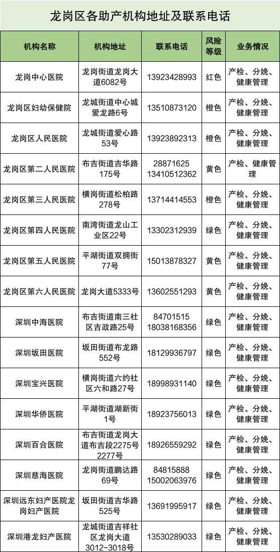 一、如您是已经在深圳市第三人民医院建册产检的孕妈妈,请您按照风险等级(又称颜色管理,可在产检本查询),就近选择助产机构进行产检(龙岗区各助产机构地址及联系电话附后)。如您正处于产后42天,请您选择辖区或就近助产机构进行产后健康管理。