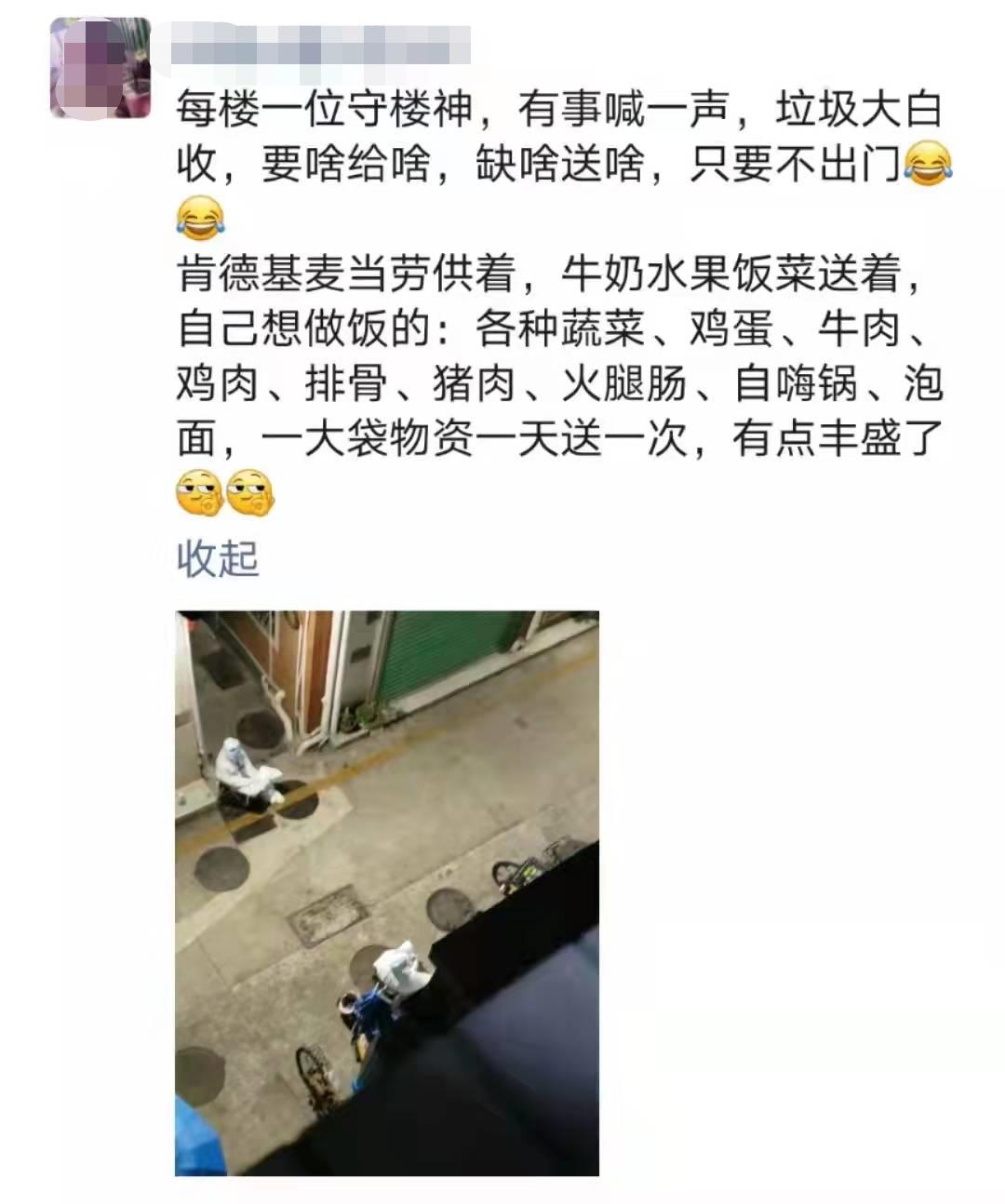 ↑上沙村封控区居民朋友圈@守楼志愿者