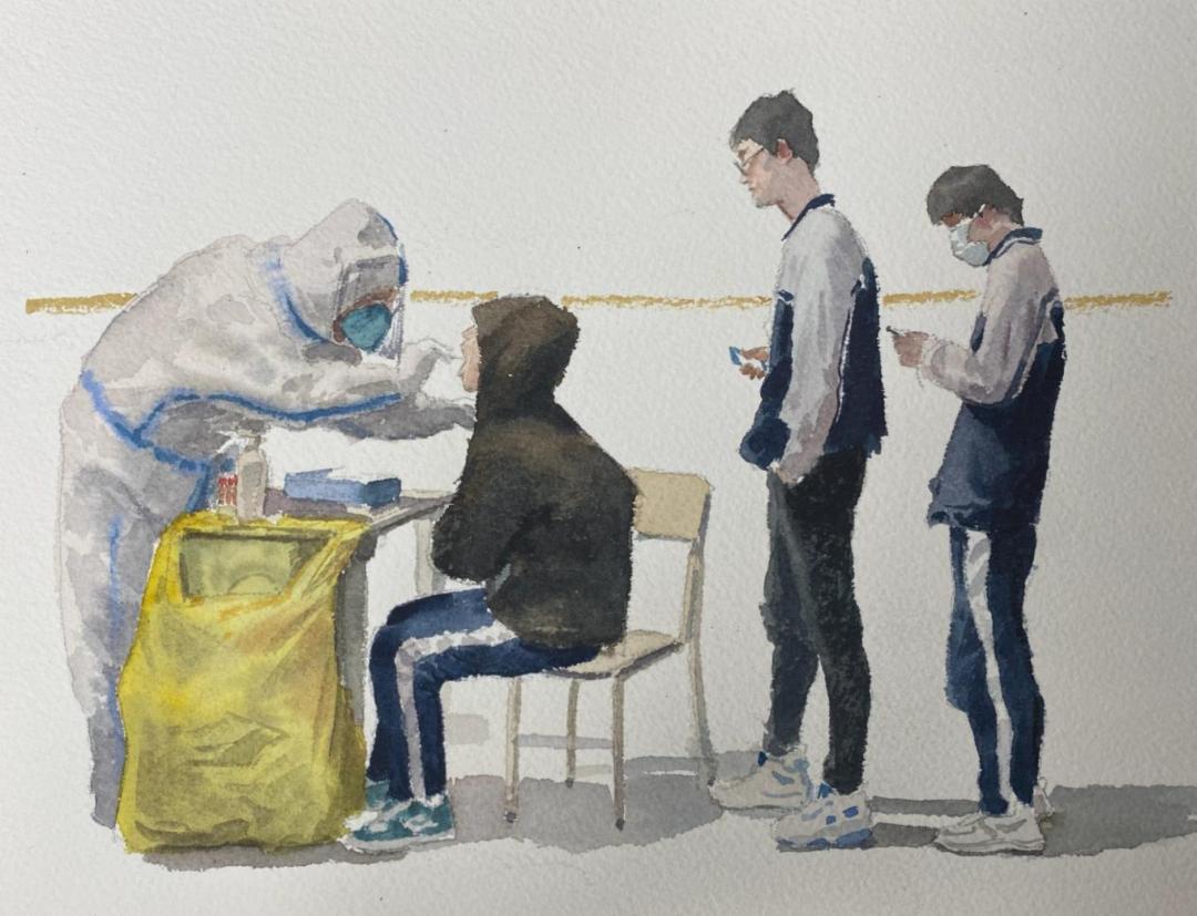 深圳市美术学校的美术教师张凯创作的《暖心学习》,描述了学生核酸检测的现场。他表示,自2月21日开始,学校就开始封闭隔离。核酸检测时间往往安排在课间,学生们都有序排队,安心学习,非常有安全感。