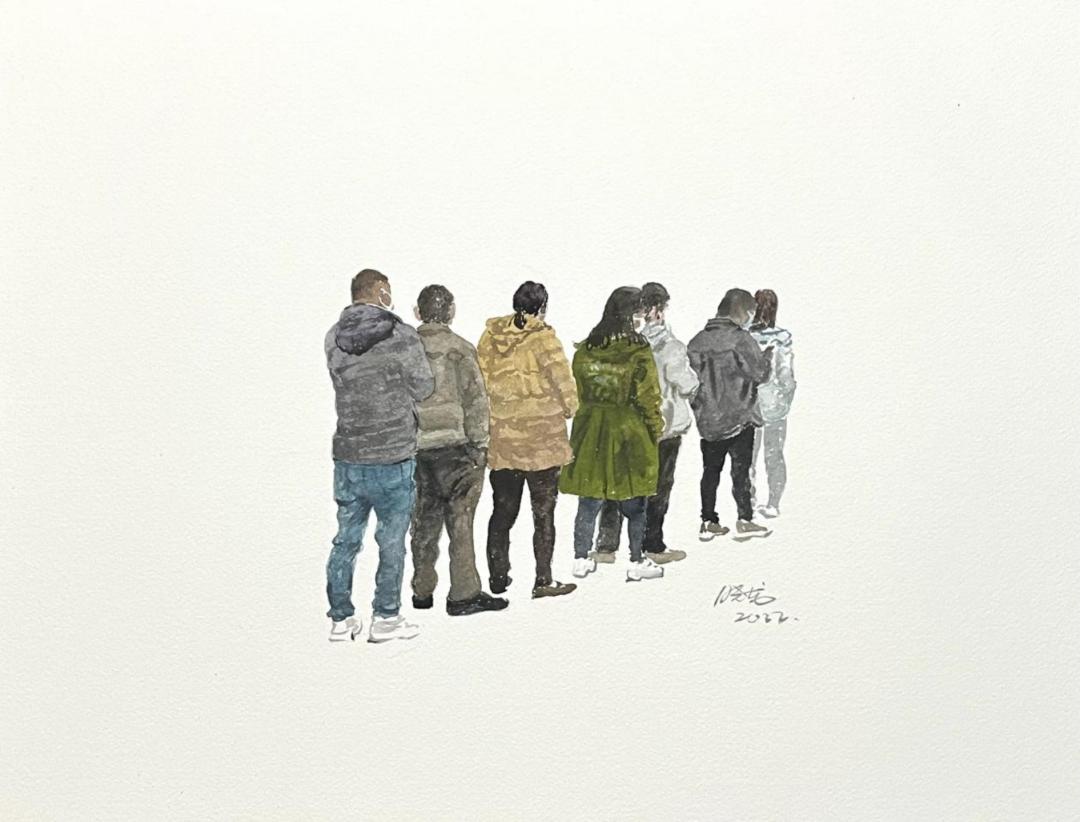 方晓龙通过核酸检测时所见,创作了《抗疫——秩序》系列作品。这些组画聚焦普通市民,呈现出井然有序的检测和发放物资的场景。